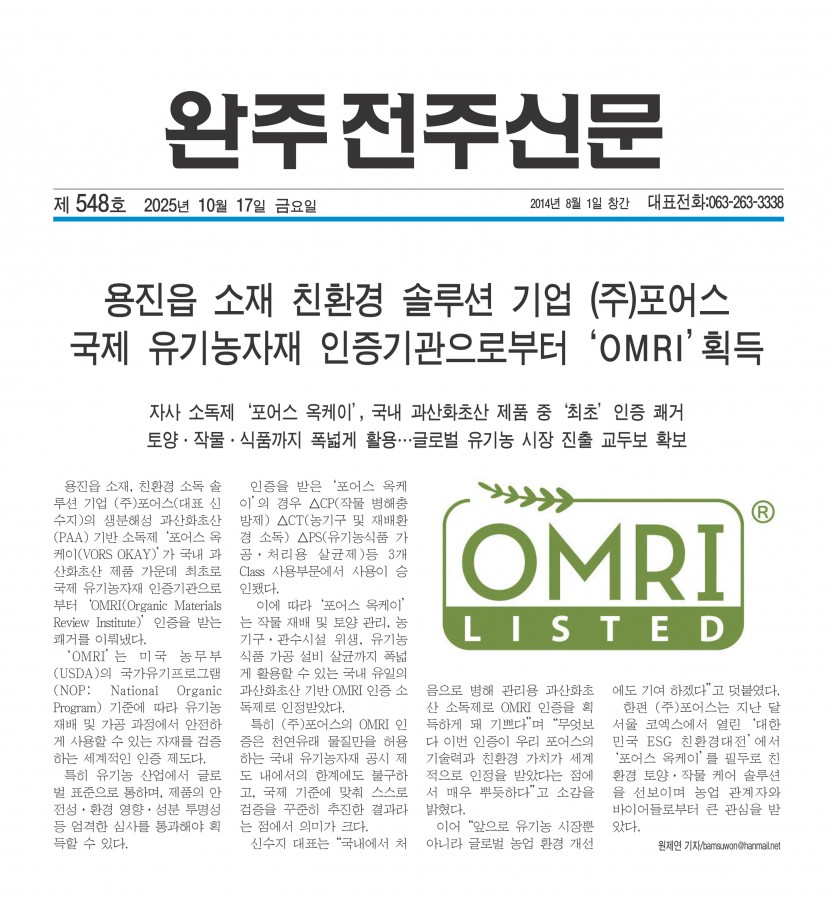 [완주전주신문] (주)포어스, 국제 유기농자재 인증기관으로부터 ‘OMRI’획득 페이지 정보 포어스 2025.11.13 15:52 조회 168 본문 (주)포어스, 국제 유기농자재 인증기관으로부터 ‘OMRI’획득 보도일자 2025.10.20 관련링크 http://www.wjgm.co.kr/news/view.php?idx=54374 113회 연결 이전글[이슈메이커] 농업 생태계에 새로운 변화의 바람 불어넣은 ‘포어스’의 발자취 25.12.02 다음글[시선뉴스] 포어스(VORS Inc.), ‘2025 케이팜 박람회’ 참가...과산화초산 기반 농업용 소독제 ‘옥케이(Okay)’로 친환경 토양 관리 솔루션 선보여 25.11.13