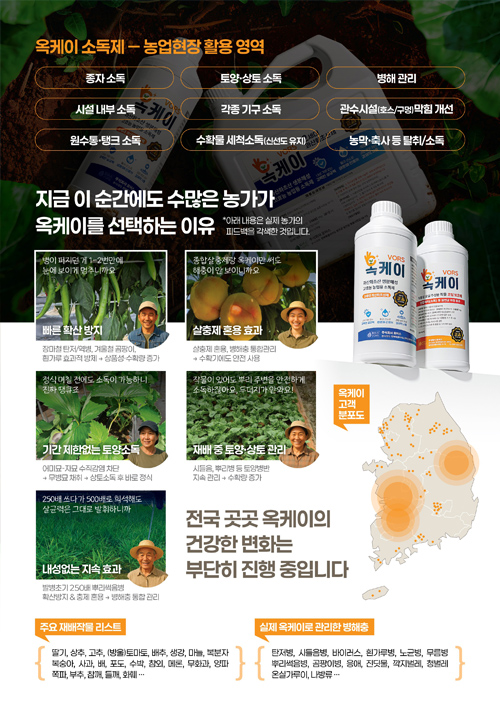 | 정식 이후 토양 소독 | 200평기준 옥케이 2kg 소요・약 1달 간격 관주 - 토양병반 예방・작물뿌리 약해 없음 |